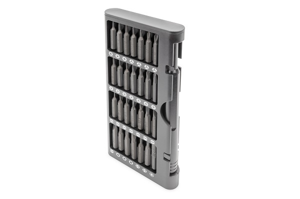 Sada nářadí DIGITUS obsahuje velký výběr šroubovacích bitů a je dodávána v praktické hliníkové krabici, která se snadno přepravuje a je rychle připravena k použití. Šroubovací bity jsou vyrobeny z vysoce kvalitní nástrojové oceli S2, a proto jsou robustní a odolné. Zejména pro opravy chytrých telefonů, instalaci počítačového příslušenství nebo pro stavbu modelů je vždy k dispozici správný šroubovák.