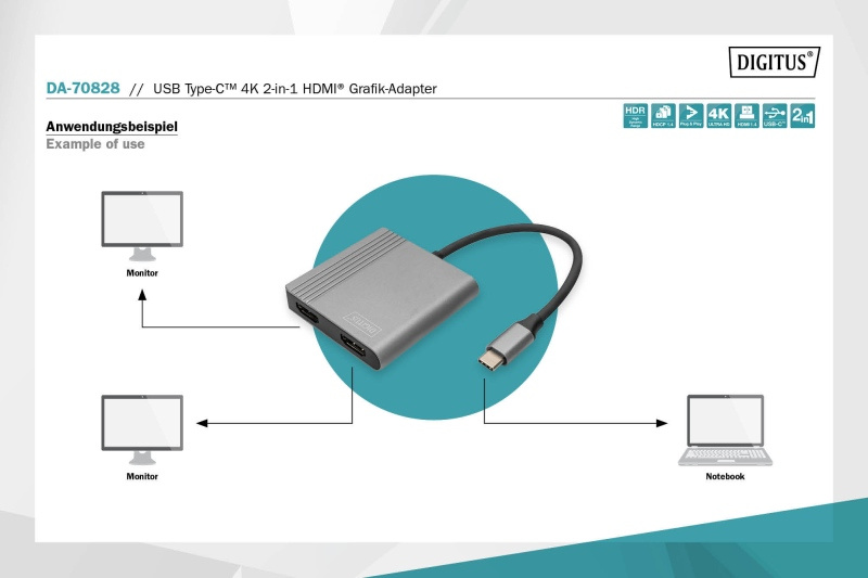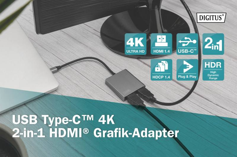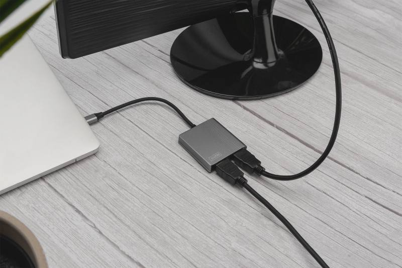 Pomocí adaptérového kabelu DIGITUS® USB-C na 2x HDMI můžete připojit až 2 monitory, projektory nebo televizory s připojením HDMI k přípojce USB-C notebooku nebo tabletu a přenášet zvuk do zvukového systému. Nejsou potřeba žádné další adaptéry. V závislosti na zdrojovém zařízení tento kabel podporuje rozlišení až 4K / 60 Hz. Díky funkci Plug and Play nemusíte instalovat žádné ovladače ani měnit nastavení - stačí zapojit a začít. Nebudete potřebovat žádné další adaptéry ani převodníky. Stačí použít kabel adaptéru DIGITUS® USB-C™ na 2x HDMI.