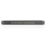 CAT 6, patch panel třídy E, stíněný, 16 portů RJ45, 8P8C, LSA, 1U, montáž do stojanu, černá, 482x44x109
