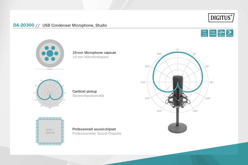 DIGITUS USB kondenzátorový mikrofon, studiový