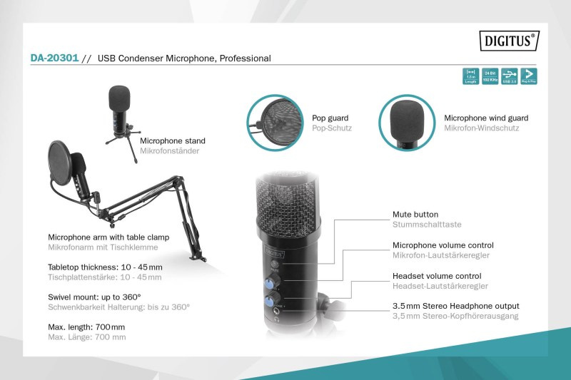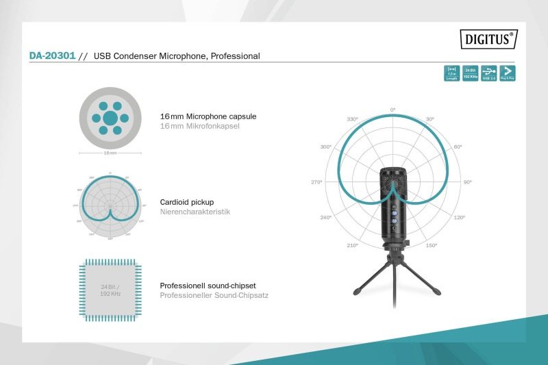 DIGITUS DA-20301 USB Kondenzátorový Mikrofon , Profesionální
