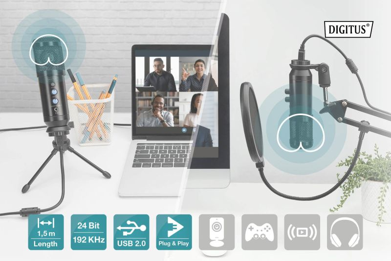 Kondenzátorový mikrofon DIGITUS USB pro PC je ideální pro nahrávání zvuku, videokonference, telefonní konference, hraní her nebo živé vysílání. Záznamový mikrofon se dodává s 1,5 m dlouhým kabelem USB a stojanem. Mikrofon podporuje směrové nahrávání s kardioidní charakteristikou, která snižuje rušivý okolní hluk. Ideální pro profesionální použití v kancelářích nebo v soukromém prostředí pro komunikaci s rodinou nebo přáteli při videohovorech, stejně jako pro hráče a streamery audia/videa.