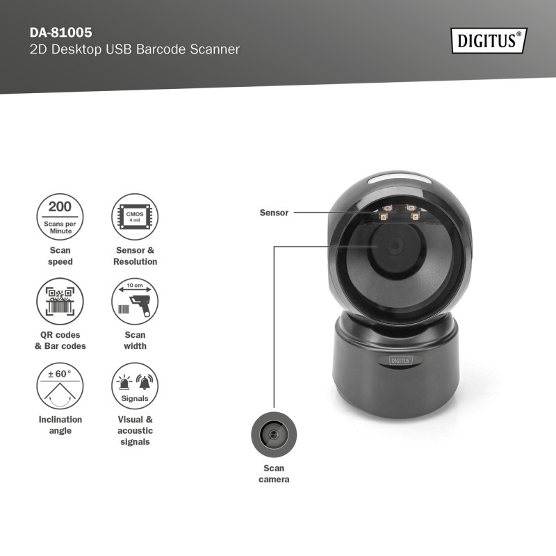 DIGITUS DA-81005 Skener čárových kódů, 2D, stolní, USB, 200 skenů/s