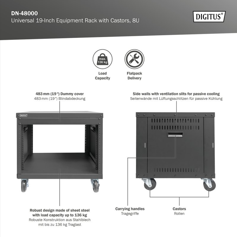 19" stojany od Digitus® jsou díky 19" závitovému děrování univerzálně použitelné. Audio video příslušenství (AVS) nebo aktivní a pasivní síťové komponenty lze namontovat během okamžiku bez potřeby klecových matic. Závitové otvory profilů umožňují kompatibilitu s U.S. nebo EU velikostmi šroubů. Oba typy šroubů jsou součástí dodávky. Konstrukce z ocelového plechu, která je odolná vůči namáhání, zajišťuje potřebnou odolnost a umožňuje nosnost až 136 kg. Ventilační otvory na obou bočních stranách zajišťují pasivní chlazení komponentů, které mají být zabudovány. V případě potřeby jsou 19 palcové racky vybaveny kolečky a držadly, takže je lze optimálně umístit. Dodává se jako nemontovaný flatpack pro optimalizaci stěny logistiky. Sestavení racku lze díky přiloženému šroubováku provést rychle a snadno. Portfolio má různé velikosti, aby bylo možné splnit každý požadavek.