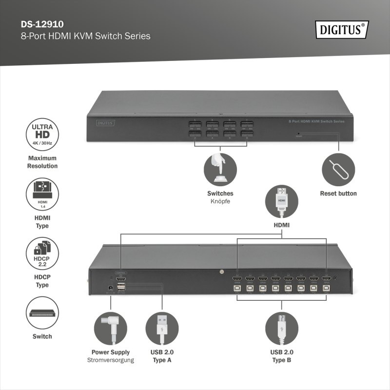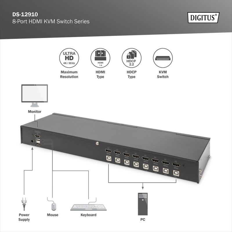 DIGITUS DS-12910 Přepínač HDMI KVM, 8 portů, jeden displej, 4K, HDMI