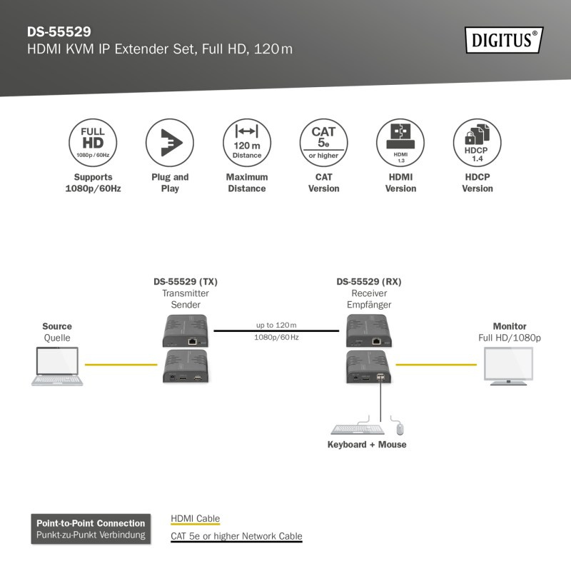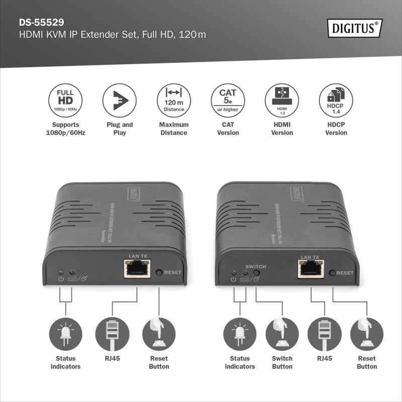 DIGITUS DS-55529 HDMI KVM IP Extender sada, Full HD, 60 Hz, 120m, černá