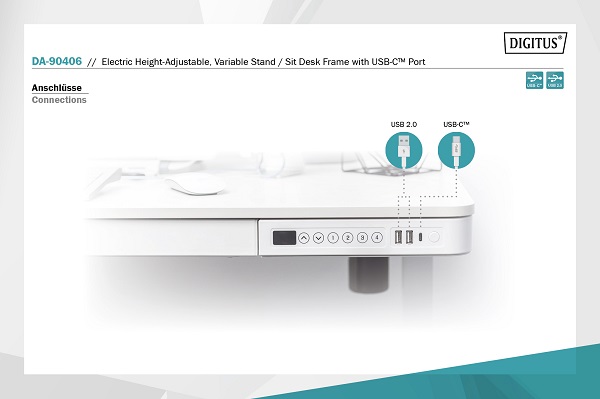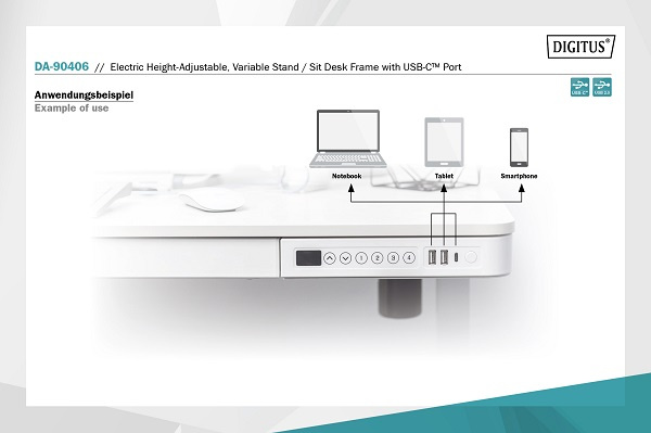 Udělejte dobrý skutek pro sebe a své zdraví s tímto výškově nastavitelným stolním rámem od společnosti DIGITUS®! Výšku stolu lze nastavit pomocí integrovaného ovládacího panelu v rozmezí 72 až 121 cm, zatímco funkce ochrany proti nárazu chrání před nárazem do překážek pod deskou stolu. Ovládací panel lze zablokovat, například aby si s ním náhodou nehrály děti. Kromě toho lze mobilní zařízení, jako jsou chytré telefony nebo tablety, nabíjet pomocí 3 dostupných konektorů USB, přičemž k dispozici jsou dva konektory USB A a jeden port USB-C™. Zásuvka umístěná pod deskou stolu poskytuje praktický úložný prostor, díky němuž si na pracovní ploše během okamžiku uděláte pořádek. Zlepšete své zdraví a předcházejte poškození postury nebo omezení pohybového aparátu pravidelným stáním!