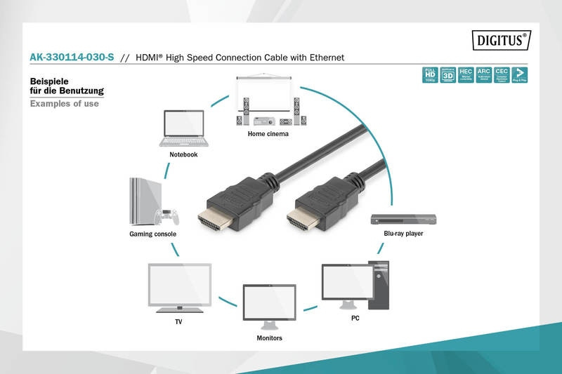 Tento proipojovací kabel s vysokým rozlišením Full HD a 3D, který se používá pro připojení audio/video zařízení, jako je přehrávač Blu-ray, herní konzole atd., Například s televizorem, monitorem nebo počítačem.