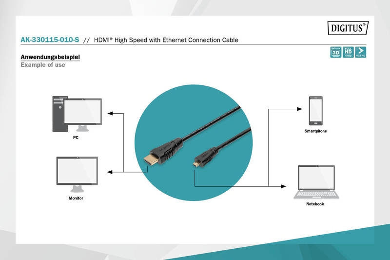 Digitus HDMI High Speed s Ethernetem připojovací kabel HDMI/D na HDMI/A ( standard na micro) , 1m,