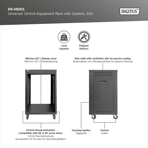 19palcové stojany od DIGITUS® lze díky perforaci závitu použít univerzálně. Audiovizuální příslušenství (AVS) nebo aktivní a pasivní síťové komponenty lze instalovat mrknutím oka, aniž byste potřebovali upevňovací matice. Závitová perforace profilů umožňuje kompatibilitu s US nebo EU velikostmi šroubů. Oba typy šroubů jsou součástí dodávky. Odolná konstrukce z ocelového plechu zajišťuje potřebnou robustnost a umožňuje maximální zatížení až 136 kg. Větrací štěrbiny na obou bočních stěnách zajišťují pasivní chlazení komponentů instalace. 19palcové stojany, vybavené válečky a držadly, jsou přenosné podle potřeby pro optimální umístění. Dodávka se provádí jako nesmontované ploché balení pro optimalizaci logistického úsilí. Stojan lze snadno a rychle sestavit díky přiloženému šroubováku a jednoduchému designu. Portfolio zahrnuje různé velikosti pro splnění jakýchkoli požadavků.