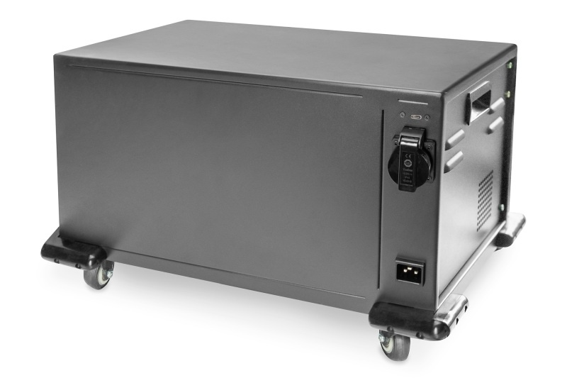 Mobilní nabíjecí skříň od DIGITUS® je ideálním a kompaktním řešením pro ukládání a nabíjení vašich přenosných zařízení, jako jsou notebooky a tablety. Mobilní nabíjecí skříně se často používají ve veřejných zařízeních, jako jsou školy, aby bylo možné bezpečně uložit zařízení na centrálním místě a zároveň je nabíjet. Součástí skříně je 16 nabíjecích stanic, z nichž všechny mají na přední straně vlastní USB připojení. Instalované ventilátory (24 V) kombinované s ventilačními štěrbinami zajišťují aktivní chlazení skříně.
