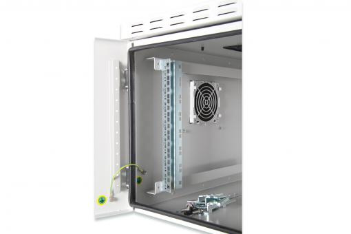 483 mm (19 ") venkovní nástěnné skříňky IP55 jsou navrženy pro průmyslové aplikace. Jsou založeny na bezpečnostní třídě IP55, která odpovídá EN 60529, a proto jsou chráněny proti vniknutí vody a nečistot. Nejlepší výkon je zajištěn např. Prostřednictvím 3-bodový uzamykací systém s uzamykatelnou výkyvnou rukojetí a izolovanými kabelovými vstupy. Integrované vstupy pro větrání vzduchu zajišťují vstup čerstvého vzduchu (ochrana proti vodě a prachu podle IP54). prostředí (déšť, prach, sněžení, sníh a stříkající voda) Skříně mohou být použity společně se soklem pro volné standangové aplikace (zadní otvory pro montáž na zeď mohou být uzavřeny zátkami, které jsou při instalaci odebrány ze základny skříně) podstavec).