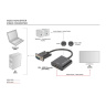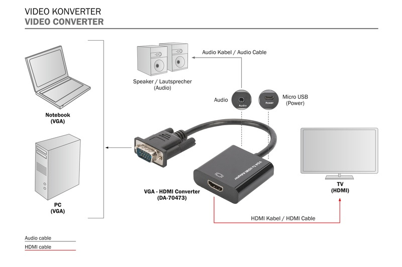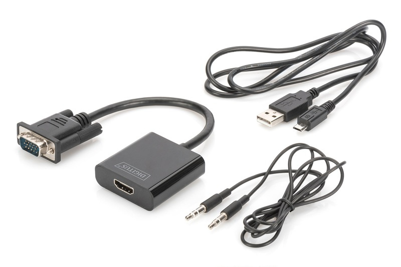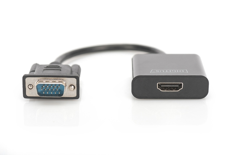 Převodník Digitus VGA na HDMI převádí váš analogový signál VGA na digitální signál HDMI. Převod umožňuje snadno připojit zařízení, která mají pouze port VGA, k monitoru HDMI, televizoru nebo projektoru. Převodník je vybaven 3,5 mm audio konektorem, protože vstup VGA může přehrávat pouze video signál. Jakýkoli existující stereofonní signál je současně převeden a integrován do signálu HDMI. To umožňuje přehrávat zvukové signály přes HMDI na vašem televizoru.