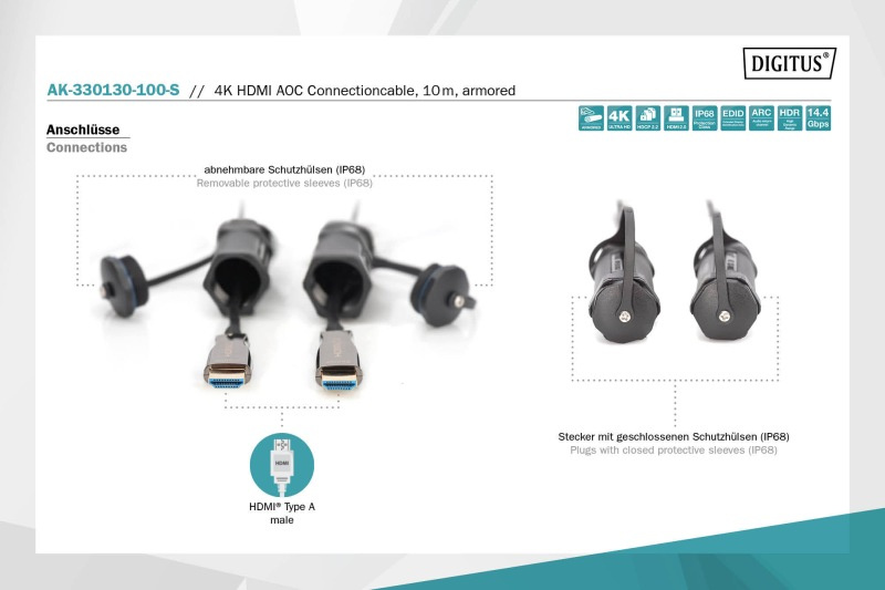 DIGITUS Připojovací kabel 4K HDMI AOC, ochranný kryt pro zástrčky IP 68; 10 m, 4K*2K@60HZ