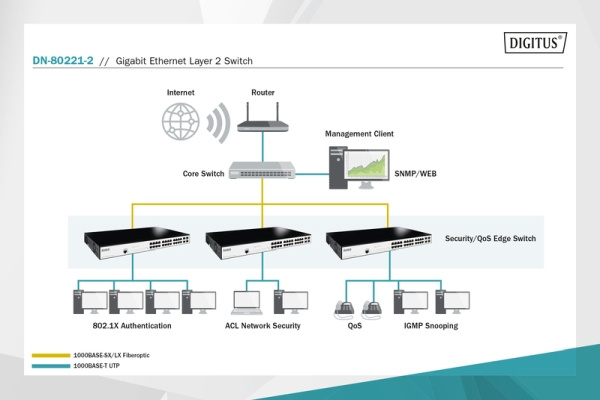 The DIGITUS® Gigabit Ethernet Layer 2 Switches with SFP ports are designed for medium to large network systems. They provide smart features that are ideal for simple QoS/CoS applications and the 19'' size makes an uncomplicated integration into your network possible. The switches are a great choice to improve the performance and efficiency of your network.