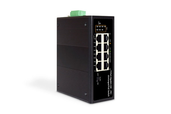 Průmyslový 7portový gigabitový PoE+přepínač+1 PD-port IEEE802.3af/at, DIN lišta, rozšířený teplotní rozsah 240W PoE budget