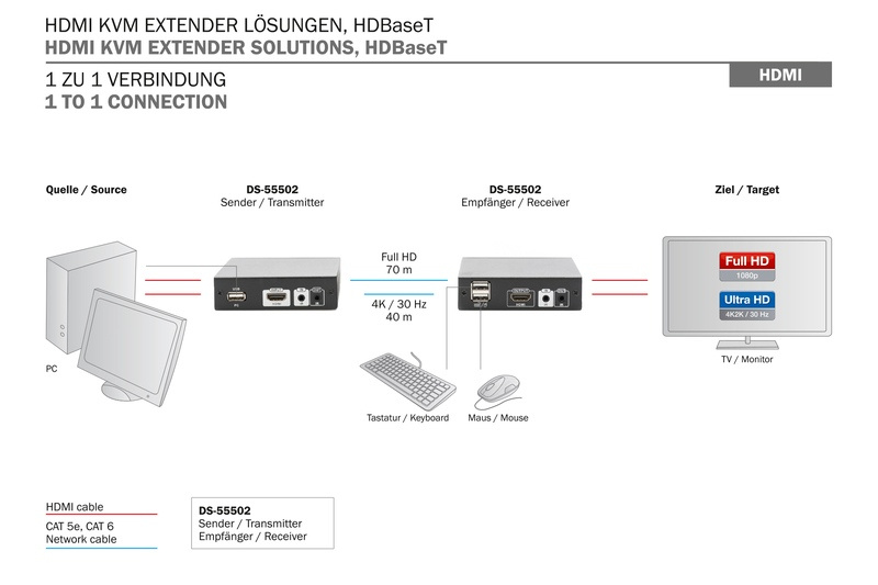 DIGITUS Sada 4K HDMI KVM Extender, HDBaseT, UHD 4K * 2K @ 30 Hz, 70 m po síťovém kabelu (kat. 5E, 6)