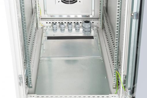 Průmyslové skříně 483 mm (19 ") jsou chráněny proti vniknutí prachu a vody v souladu s bezpečnostní úrovní IP55 (IEC EN 60529), aby poskytovaly optimalizované podmínky pro uživatelsky přívětivou instalaci aktivních a pasivních součástí sítě doprovázených úhledným vedením kabelů v barva je tvořena 70-90 µm silným práškovým nátěrem v barvě šedé (RAL 7035) se schopností přilnavosti podle EN ISO 2409: třída 0 až 1. Další provedená 500 hodinová zkouška odolnosti vůči postřiku solí potvrzuje možný rozsah provozních teplot od -25 ° C do +70 ° C. Vnitřní montážní profilové lišty 483 mm (19 ”) (dva páry = 4 kusy) jsou galvanicky pozinkovány a označeny výškovými jednotkami (počítatelné z obou směrů). jsou variabilní v hloubce a jsou spojeny s přídavnými podpůrnými tyčemi pro realizaci rozsáhlých instalací zařízení o délce 483 mm (19 ”). Dále je uvnitř konstrukce otočného profilu. Každá skříň je vybavena soklem (výška 100 mm), který nabízí additio prostor pro kabeláž. Základna každé skříňky je vybavena posuvným kabelovým vstupním panelem s gumovým těsněním a pěti kabelovými vstupy PG (4x PG21 + 1x PG48). Rozsáhlé portfolio příslušenství pro správu kabelů, police atd. Pomůže splnit mnoho požadavků při každodenním používání.