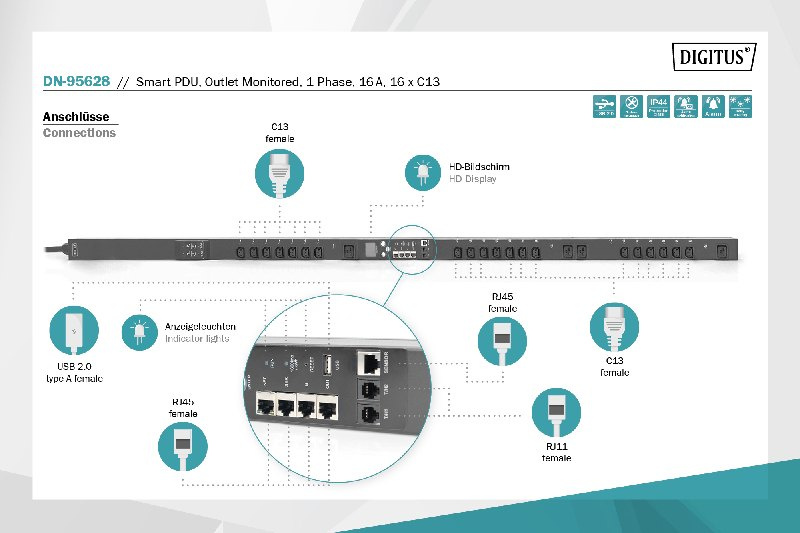 DIGITUS Smart PDU, Monitorovaná zásuvka, 1fázová, 16 A, ( výstup 16 x C13, vstup IEC309 16A)