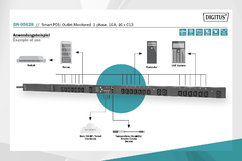 DIGITUS® Smart PDU vám nabízí možnost vzdáleného sledování proudu, napětí, celkové spotřeby energie, celkového výkonu a výkonu na vstupní úrovni, jakož i aktuální, napájecí a energetické spotřeby na výstupní úrovni. Limitní hodnotu lze nastavit pro celkový proud a alarm vás upozorní na potenciální přetížení systému. Je také povoleno sledování provozního stavu, stejně jako proudu, energie a výkonu na úrovni jističe. To umožňuje efektivní správu a distribuci energie. K zařízení lze přistupovat a konfigurovat je prostřednictvím webových, SNMP a Telnetových rozhraní. S možností připojení senzorů může jednotka obsahovat kompletní systém monitorování prostředí pro řízení teploty, kouře, vlhkosti a netěsností v regálech. Až pět napájecích proužků, které sdílejí stejné síťové připojení a IP adresu, lze připojit sériově. Kromě toho lze PDU snadno integrovat do regálů s možnostmi instalace bez nástrojů.