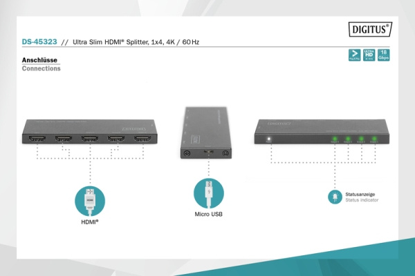 Digitus Ultra tenký HDMI Rozbočovač, 1x4, 4K / 60Hz HDR, HDCP 2.2, 18 Gbps, Micro USB napájeno