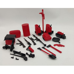 Součástí doplňků jsou zbraně, kanystry, nářadí, lékárnička, hasící přístroj, batoh, sud, pánev aj. Doplňky jsou nesložené viz foto.