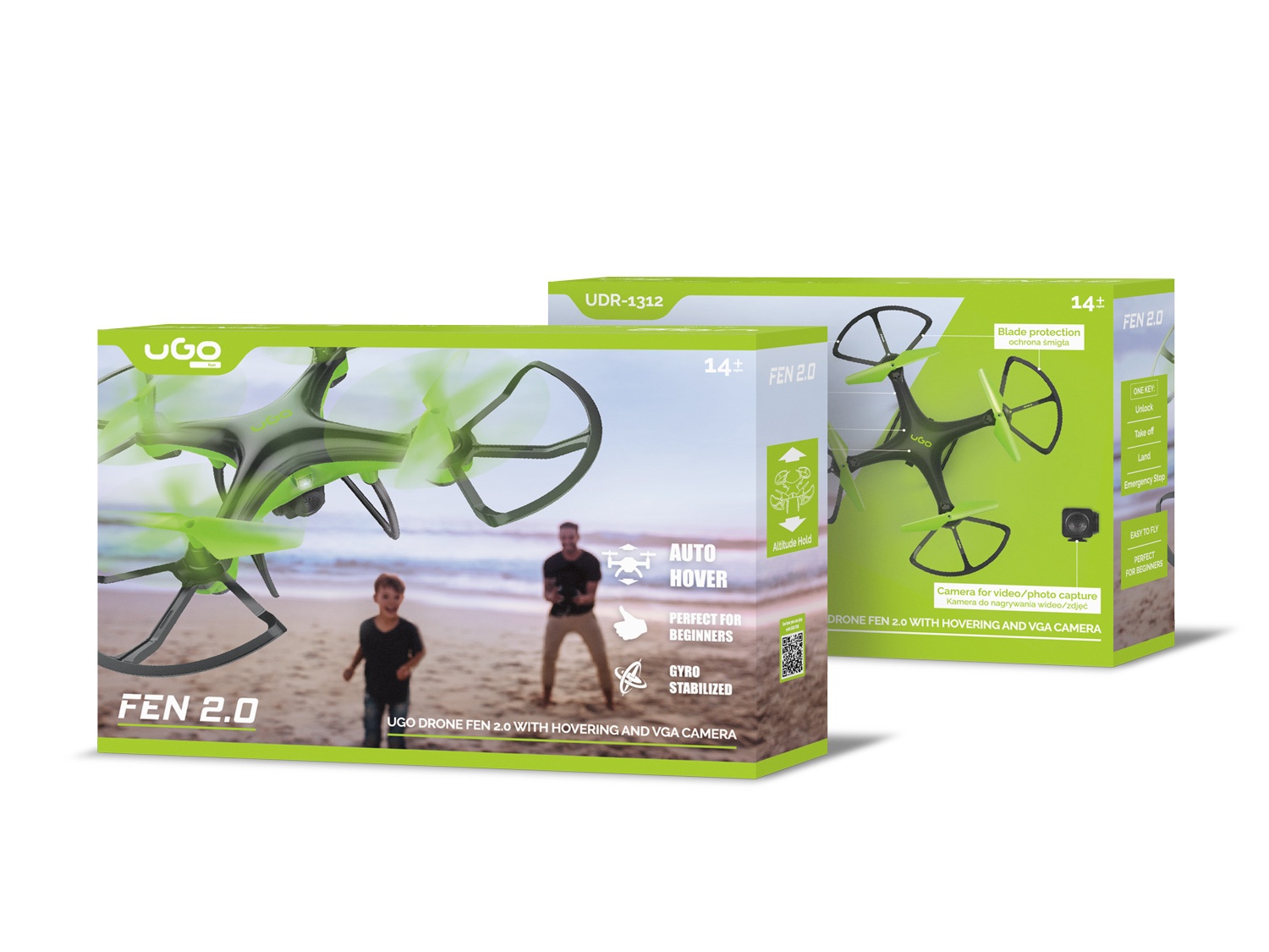 Ugo Fen 2.0 je dron určen pro méně náročných uživatelů, kteří potřebují zařízení do zábavy s praktickými funkcemi pro zvyšovaní svých dovedností. Dodatečně svůj let a letecké akrobace může uživatel zaznamenat pomocí vestavěné kamery VGA na paměťovou kartu a těšit se tak z neopakovatelných video záběrů a snímků. Dron obsahuje několika užitečných funkcí: automatické udržovaní letové hladiny, automaticky vzlet a přistání, díky čemuž si s nim poradí i méně zručný uživatelé.