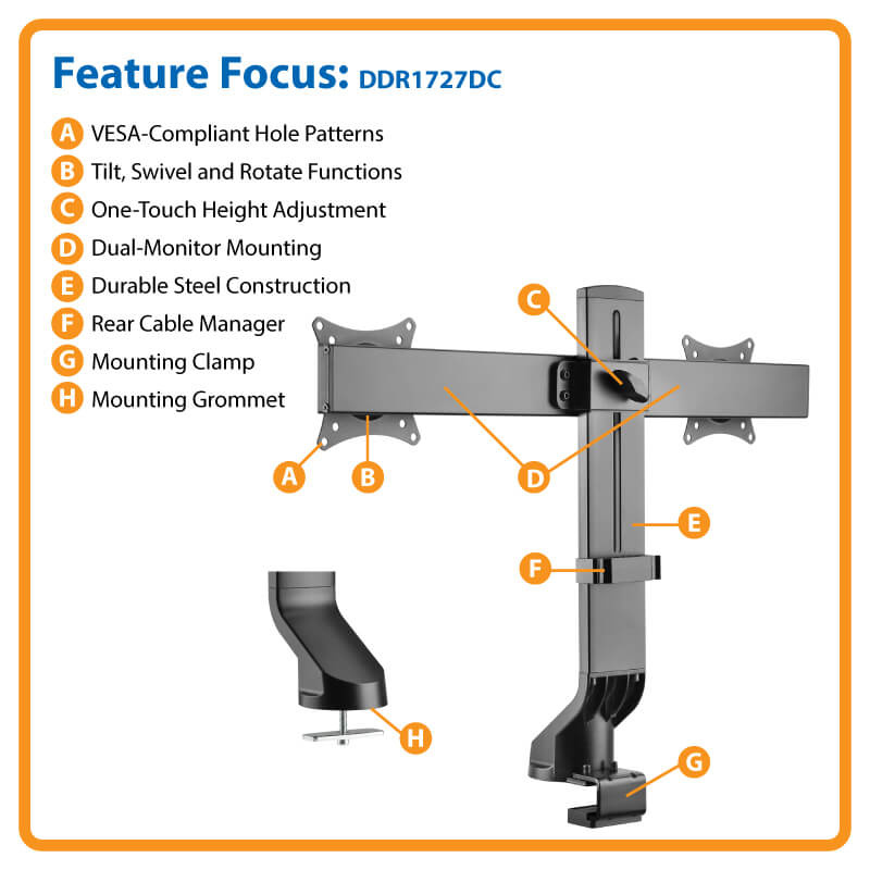 *Připevňuje 2 monitory k vašemu pracovnímu prostoru pomocí svorky nebo průchodky a umožňuje vertikální nastavení jedním dotykem pomocí snadno uchopitelného knoflíku