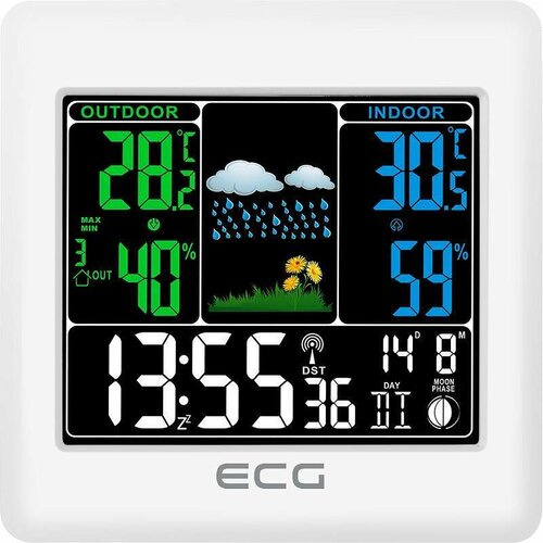 Meteostanice ECG předpovídá počasí na dalších 24 hodin ve 4 režimech ikonami pro slunečno, polojasno, zataženo a srážky. Budete tak vždy vědět, kdy si přibalit deštník nebo naopak nezapomenout doma sluneční brýle. Zobrazuje vnitřní i venkovní teplotu a vlhkost. Dokonce indikuje i pohodu v místnosti (sucho, pohodlí, vlhko) podle ikon tváře.