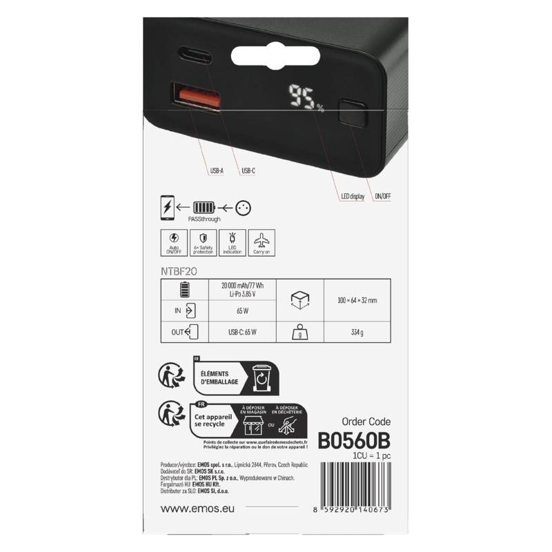 EMOS PWB NTBF20 20000MAH 65W PD 1×USB-C 1×USB-A