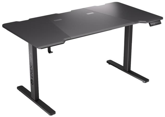 Herní stůl o délce 150 cm a šířce 78 cm nabízí dostatek prostoru pro myš, klávesnici a další příslušenství. Výšku lze plynule nastavit v rozsahu 73 - 120 cm pouhým stisknutím tlačítka na ovládacím panelu, který navíc umožňuje uložit až čtyři nastavení výšky. Na spodní straně desky je umístěn systém pro správu kabelů. Maximální stabilitu zajišťuje robustní ocelová konstrukce s nosností až 80 kg. Povrchová úprava desky stolu ve stylu uhlíkových vláken nejen dobře vypadá, ale je také odolná proti poškrábání. V neposlední řadě zajisté potěší kovová polička pro napájecí lištu na zadní straně a háček pro zavěšení sluchátek.