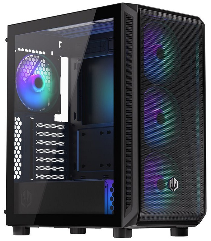 Skříň formátu Middle Tower s průhlednou bočnicí nabízí šest 2,5" pozic pro SSD disky a jednu 3,5" pozici pro pevný disk. Na horním panelu naleznete dva porty USB 3.0, jeden port USB-C a dále také konektor pro sluchátka a konektor pro mikrofon. Skříň je osazena čtyřmi ventilátory o velikosti 140 mm s ARGB podsvícením. Důmyslné řešení umožňuje pohodlné umístění až 360 mm dlouhého výměníku vodního chlazení na přední straně. Ve skříni je dostatek prostoru pro chladič CPU do výšky až 179 mm a grafickou kartu o délce 350 mm. Skříň je dodávána bez zdroje. Součástí je také sada prachových filtrů.