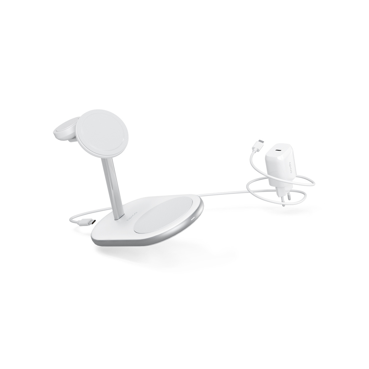 Nabíjecí stojánek, bezdrátový, certifikace Made for MagSafe, Made for Watch, bezdrátové nabíjení iPhone 15W, nabíjecí plocha pro AirPods 5W, rychlonabíjecí modul pro Apple Watch 3W, kabel součástí, 30W PD adaptér součástí, barva bílá