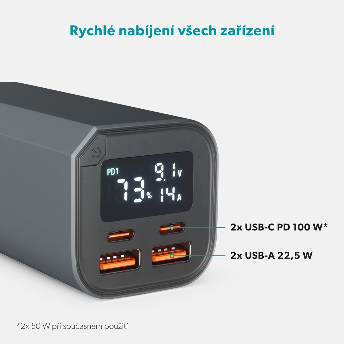 USB-C výstupy: Dva USB-C porty s výkonem až 100 W samostatně (50 W každý při současném použití), vhodné pro energeticky náročná zařízení.