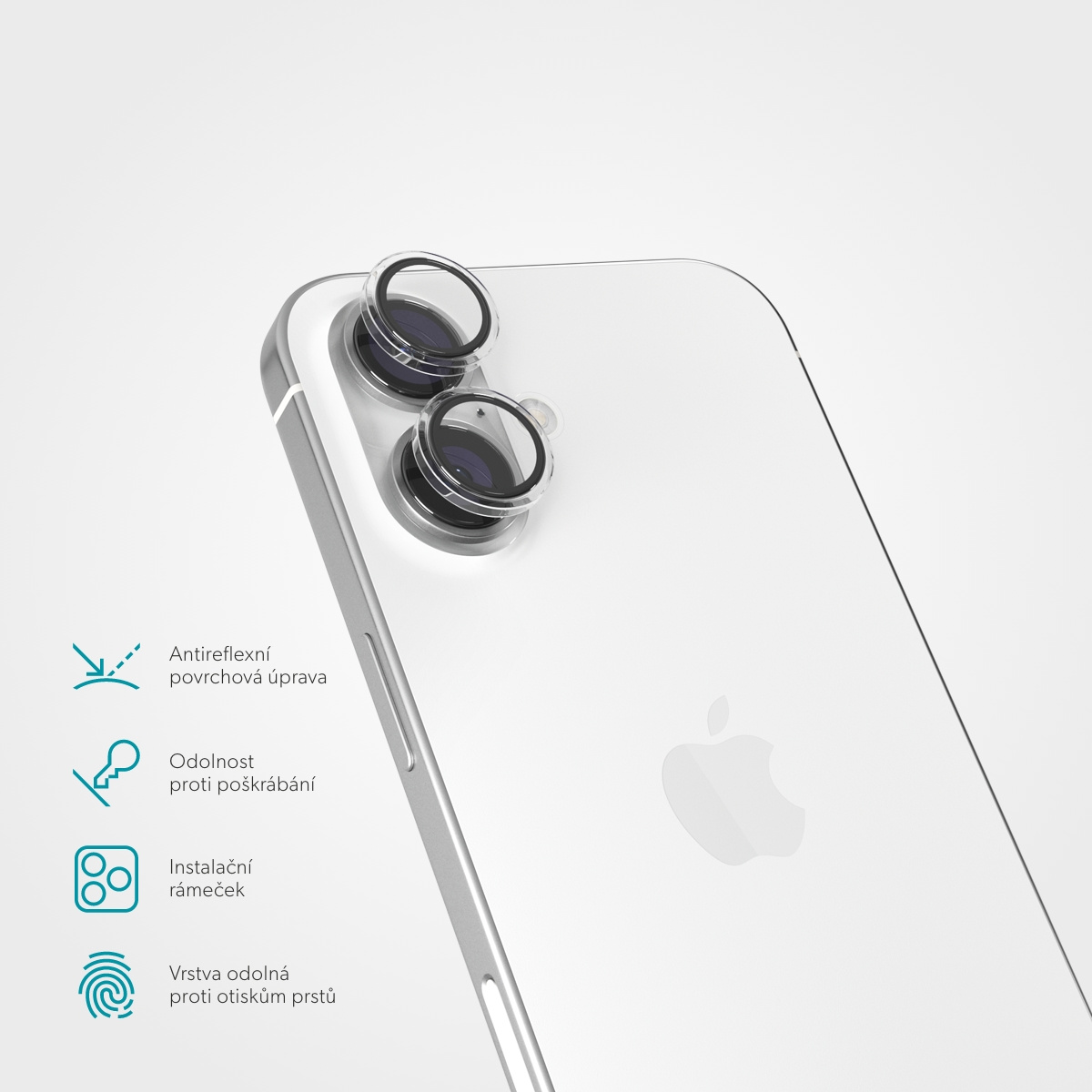 Ochrana pro čočky fotoaparátu, pro Apple iPhone 16/16 Plus, tvrzené sklo, tvrdost 9H, součástí: instalační rámeček.