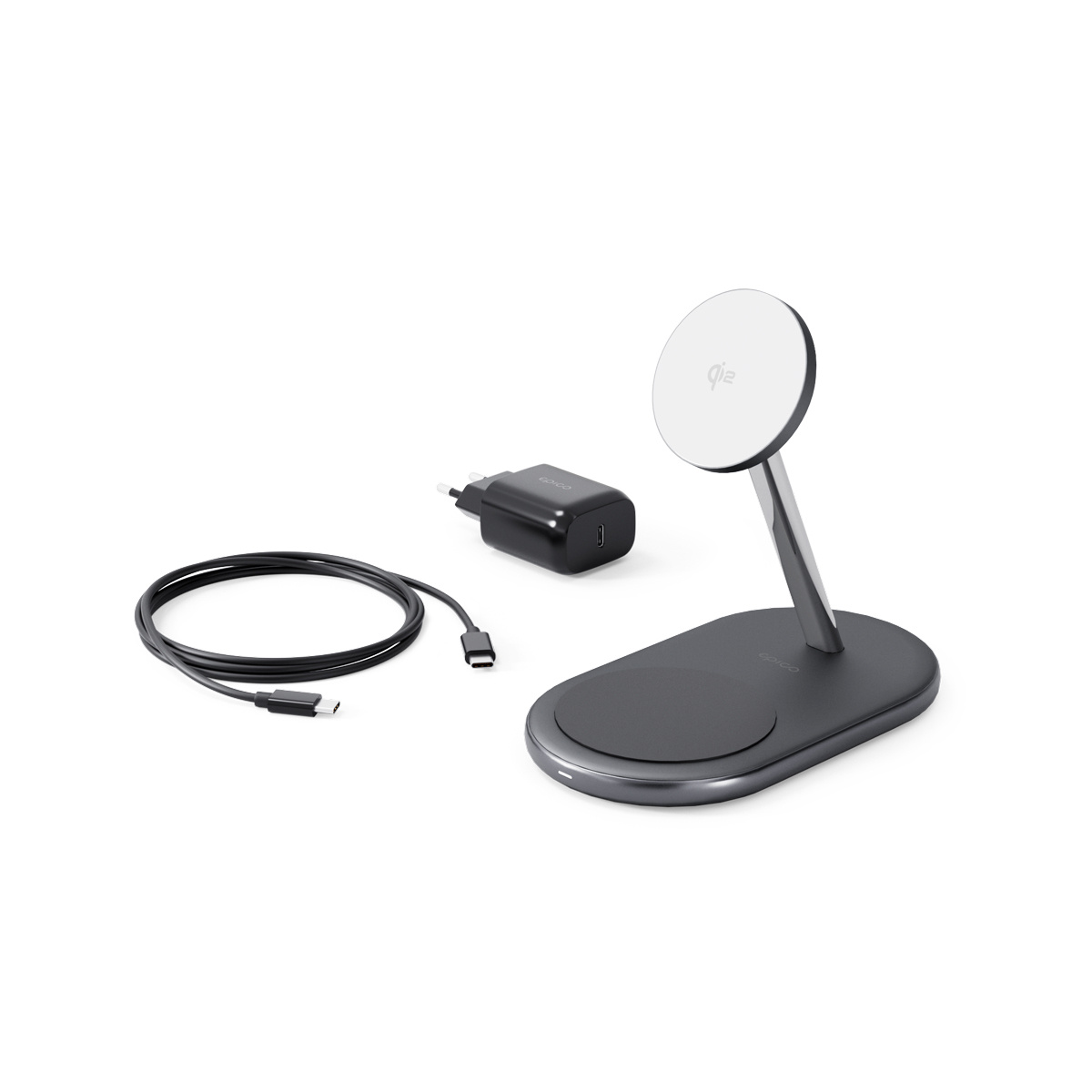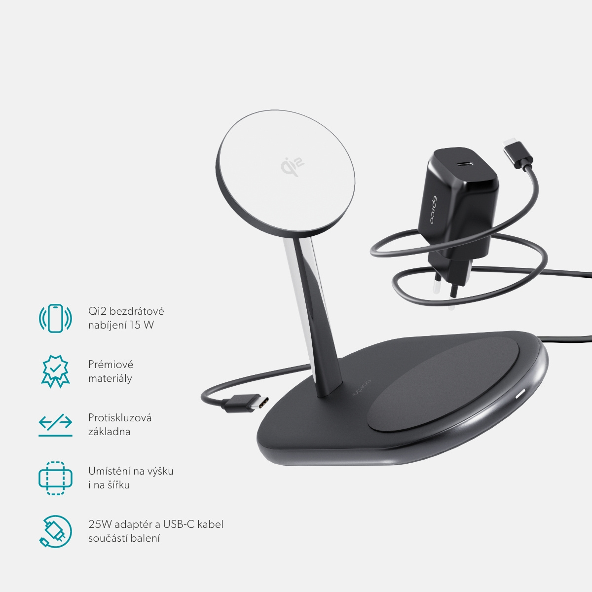 Bezproblémové nabíjení s propracovaným designem Elegantní design: Vyrobeno z prémiových materiálů, které z této nabíječky dělají krásný doplněk na váš stůl. Certifikace Qi2 & kompatibilita s MagSafe. Užijte si až 2x rychlejší bezdrátové Qi2 nabíjení pro iPhone (15W) s magnetickým uchycením. 2v1 nabíjení: Umožňuje současné nabíjení smartphonu a AirPods (5W). Stabilní gumová základna: Vybavena protiskluzovou gumovou základnou pro lepší stabilitu. Flexibilní umístění: Podporuje umístění smartphonu na výšku i na šířku.