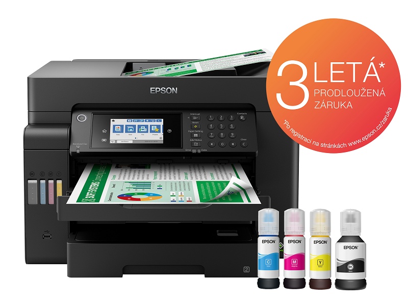 Tato tiskárna EcoTank s bohatou nabídkou funkcí podporuje formát A3+ a vyznačuje se nízkými náklady na tisk jedné strany. Vysoká rychlost tisku a skenování, dva přední zásobníky na 250 listů papíru, zadní podavač na 50 listů a automatický podavač dokumentů s kapacitou 50 listů A3 šetří váš čas při práci s formátem A3+. Díky funkcím mobilního tisku, připojení přes Ethernet a dotykovému LCD displeji s úhlopříčkou 10,9 cm a fyzickými tlačítky můžete tisknout tak, jak právě potřebujete.
