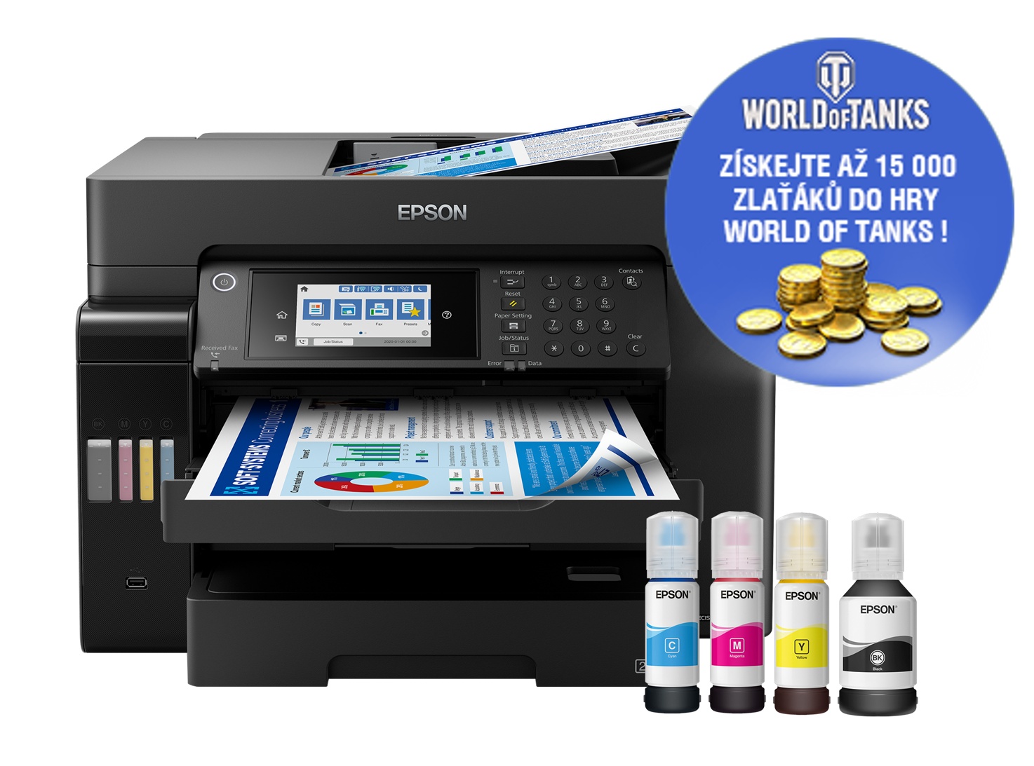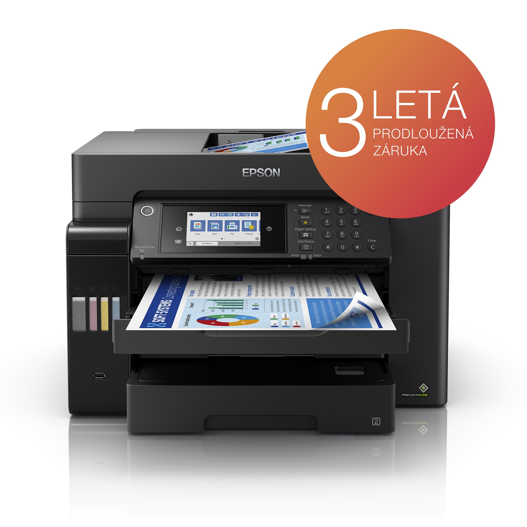 Tato tiskárna EcoTank s bohatou nabídkou funkcí podporuje formát A3+ a vyznačuje se nízkými náklady na tisk jedné strany. Vysoká rychlost tisku a skenování, dva přední zásobníky na 250 listů papíru, zadní podavač na 50 listů a automatický podavač dokumentů s kapacitou 50 listů A3 šetří váš čas při práci s formátem A3+. Díky funkcím mobilního tisku, připojení přes Ethernet a dotykovému LCD displeji s úhlopříčkou 10,9 cm a fyzickými tlačítky můžete tisknout tak, jak právě potřebujete.