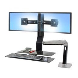 Description: WorkFit-A, Dual Monitor Sit-Stand Workstation, with Worksurface (polished aluminum/black)