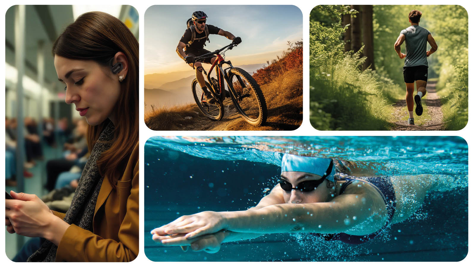 • Revoluční zvuková technologie Bone Conduction s přenosem zvuku přes lícní kosti do vnitřního ucha umožňující poslech hudby a současné vnímání okolí