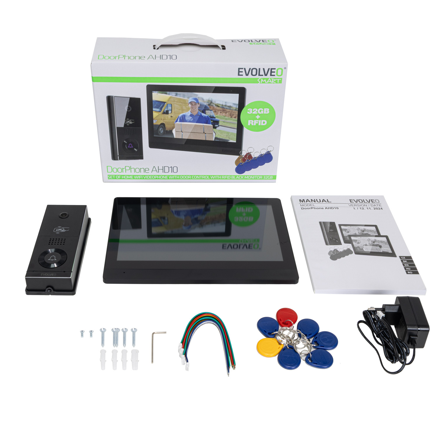 EVOLVEO DoorPhone AHD10, Sada domácího WiFi videotelefonu s ovládáním dveří a RFID, černý 10" monito