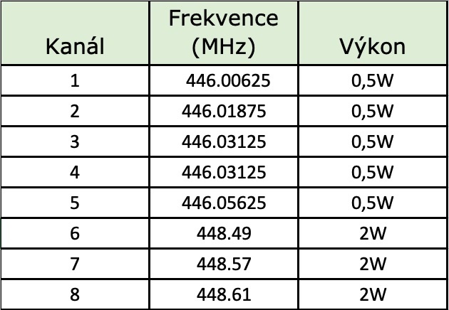 - 5 kanálů, frekvence 446MHz, výkon 0,5W, dosah až 9km