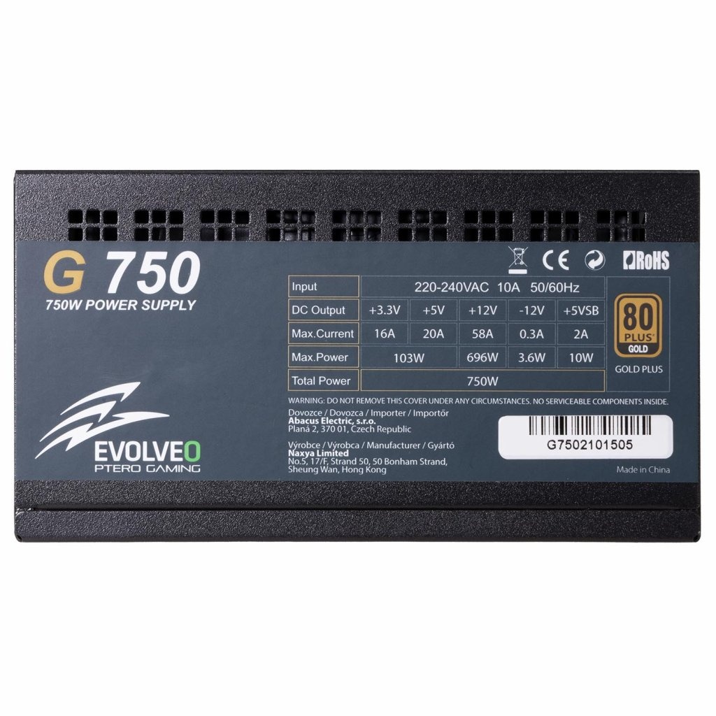 Zdroj EVOLVEO G750 je ideální volba do jakéhokoliv herního počítače. Vyjímá se především účinností s certifikací 80 PLUS GOLD zaručující účinnost až 90%. Zdroj je plně modulární, z toho důvodu je možné připojit jen nejnutnější kabely. Součástí je i tichý 140mm ventilátor. V kombinaci se semi-pasivním chlazení do 30% zatížení je zaručen tichý chod zdroje. Nedílnou součástí jsou i ochrany proti poškození komponent v PC a i zdroje samotného.