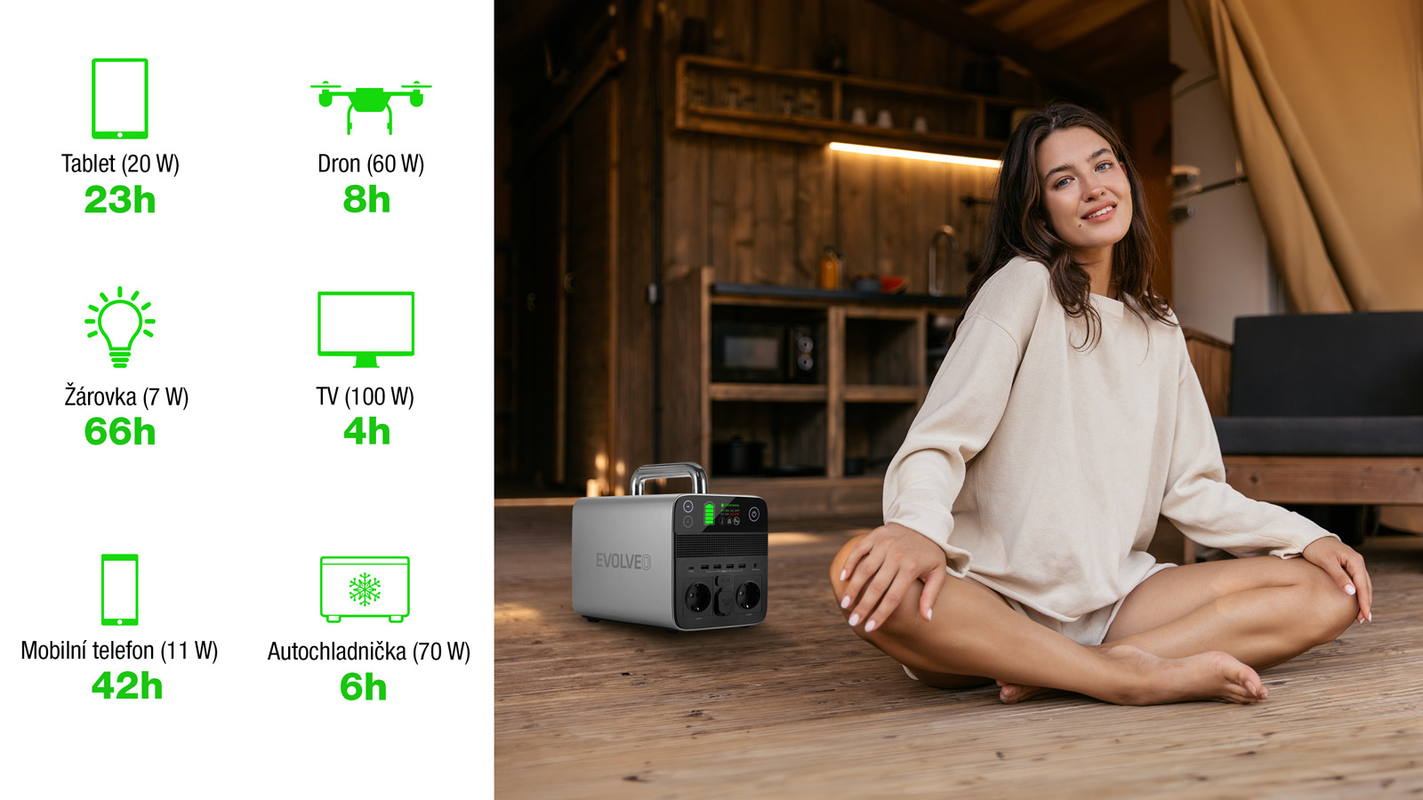 • Výdrž napájení spotřebiče: tablet (20 W) – 23 h, dron (60 W) – 8 h, mobilní telefon (11 W) – 42 h, žárovka (7 W) – 66 h, TV (100 W) – 4 h, autochladnička (70 W) - 6 h