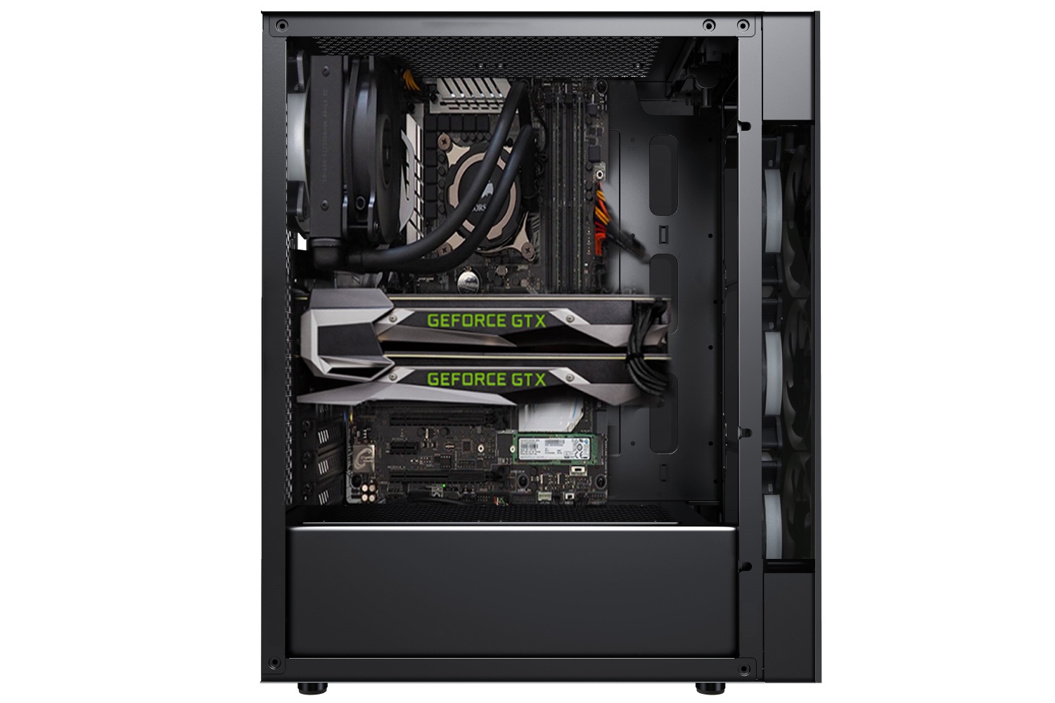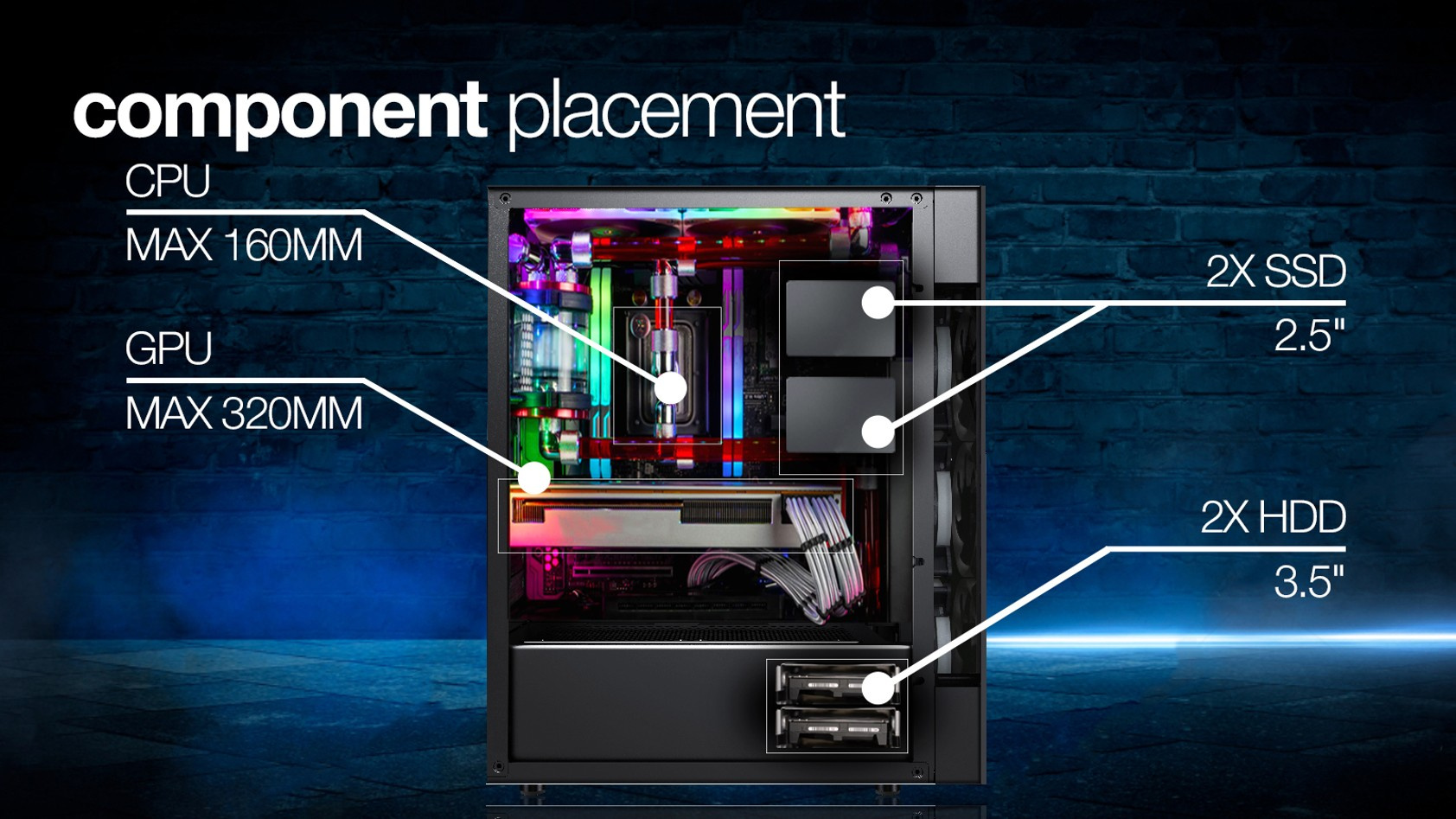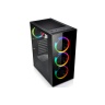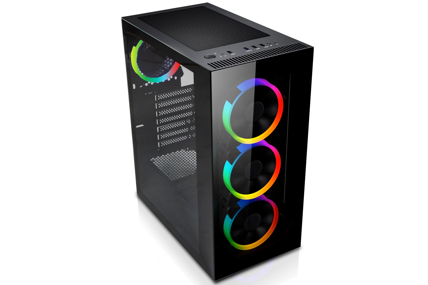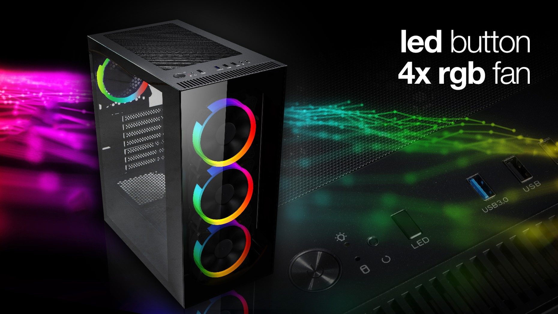 Herní ATX midi tower s instalovanými 4x RGB rainbow 120 mm ventilátory, které se ovládájí pomocí LED tlačítka n horní straně ovládacího panelu. Přední a obě boční strany jsou z tvrzeného skla . Skříň je určená pro základní desky podporující platformu Intel i AMD. Mimo formátu ATX je kompatibilní i s formátem Micro ATXa Mini ITX. Napájecí zdroj se umísťuje do dolní části skříně. Spodní mřížka je osazena vysouvacím prachovým filtrem, horní prachový filter je uchycený magnety a je odnímatelný. Ventilátory jsou 4pin s MOLEX napájením a připojují se vzájemně na sebe bez nutnosti jakéhokoliv řadiče. Ovládání ventilátorů je možné pouze pomocí LED tlačítka na kontrolním panelu skříně.