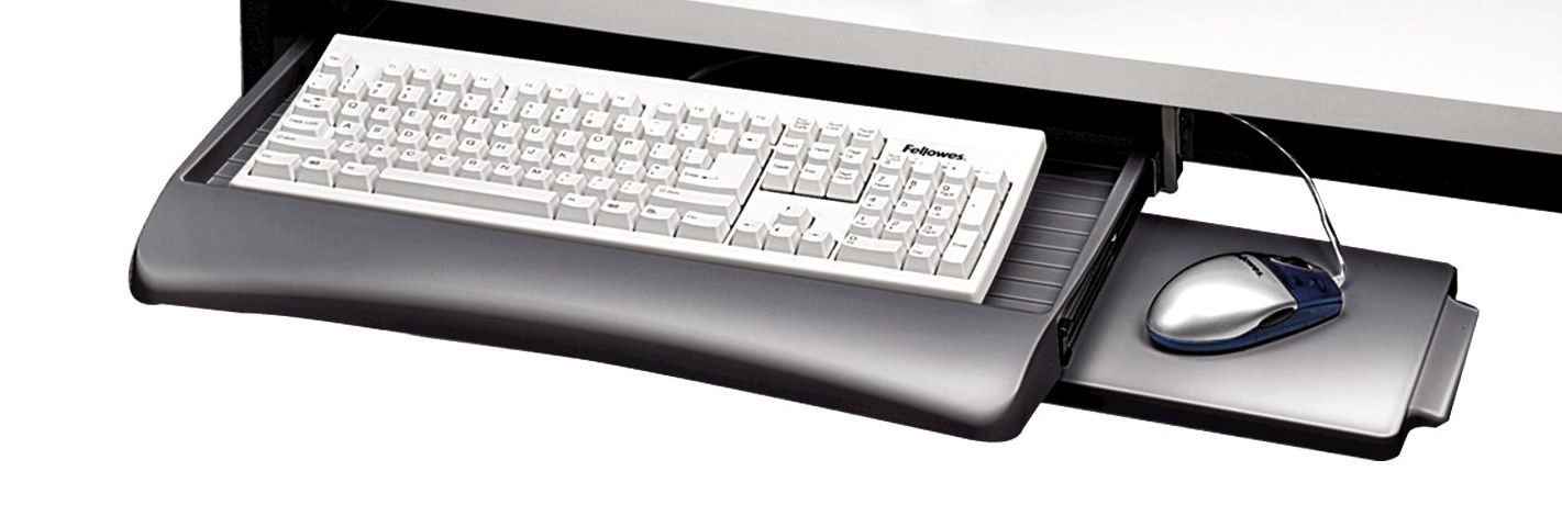 Používáním držáku klávesnice a myši Fellowes předcházíte bolesti zápěstí. Instalace pod pracovní desku psacího nebo obyčejného stolu umožňuje získat dodatečný využitelný prostor. Vhodné do kanceláře i domácnosti. Usnadňuje organizaci věcí na pracovním stole.