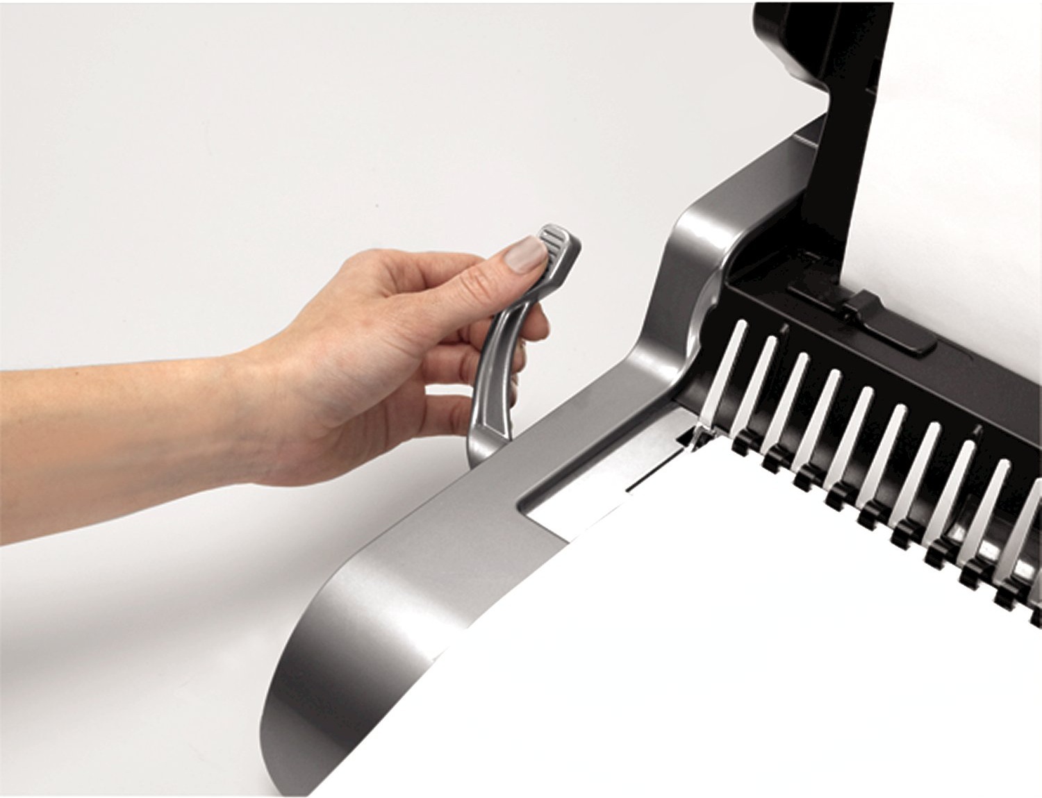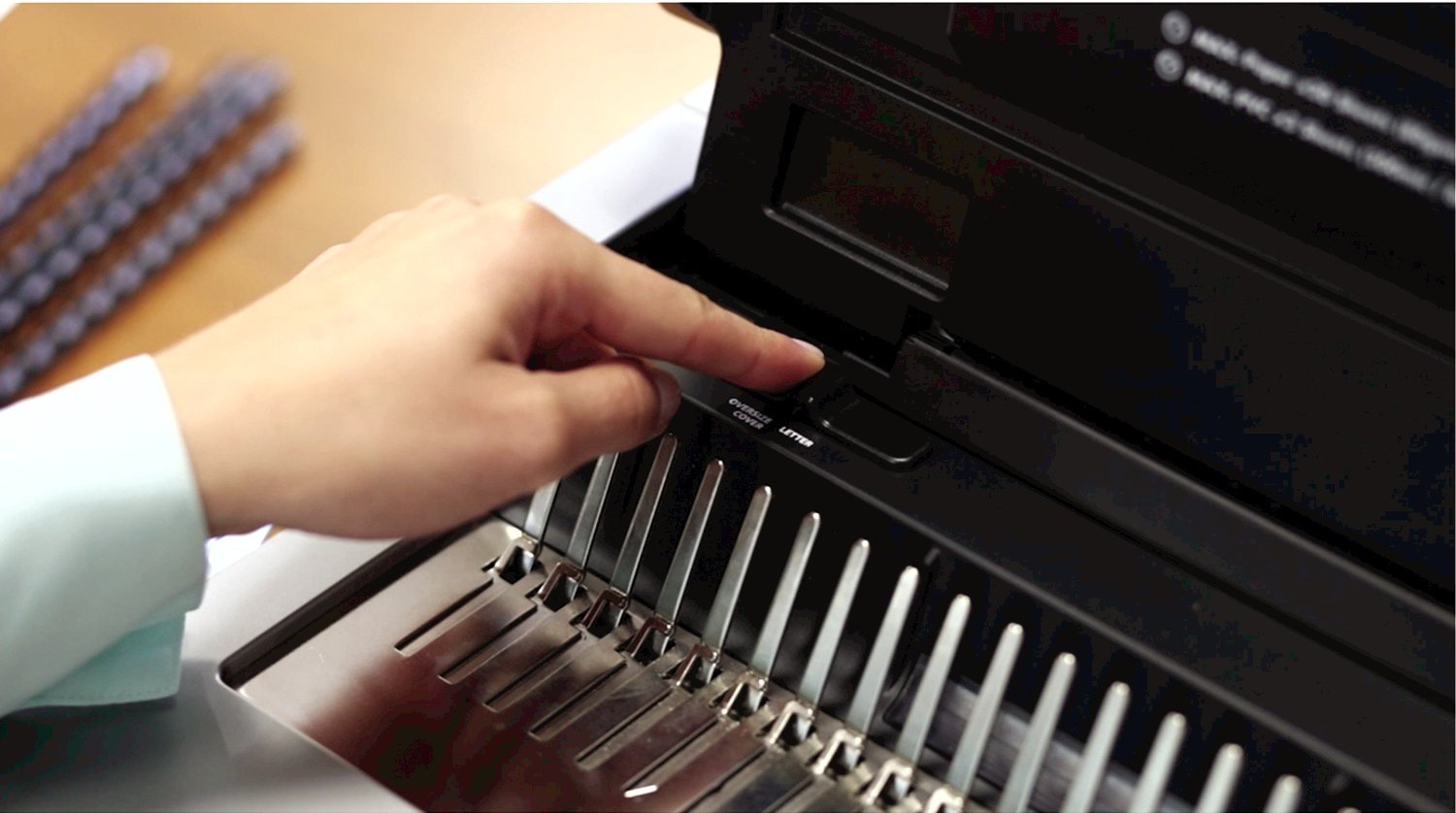 Stroj je vybaven větším zásobníkem na uložení několika plastových hřbetů a integrovanou měrkou pro správnou volbu průměru hřbetu. Na čelní straně stroje je průzor pro snadnou kontrolu zaplnění odpadního prostoru.