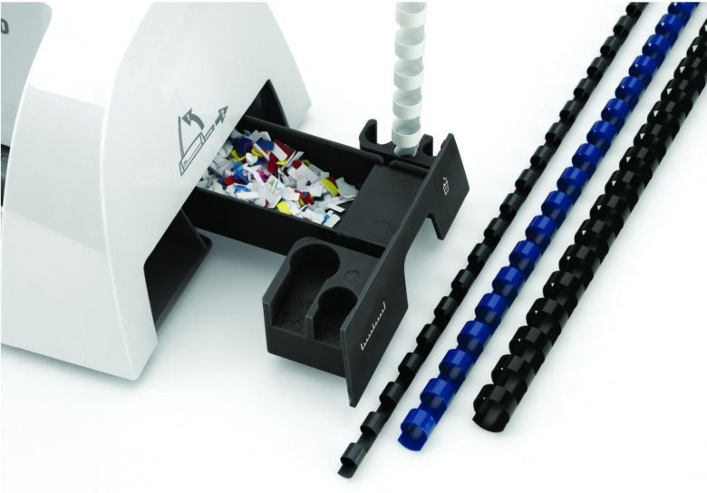 Oddělená děrovací a vázací páka pro průběžné vkládaní děrovaných listů do plastového hřbetu výrazně zefektivňuje práci. Díky delší děrovací páce je třeba k děrování minimum síly. Stroj je vybaven integrovanou měrkou pro správnou volbu průměru hřbetu.