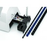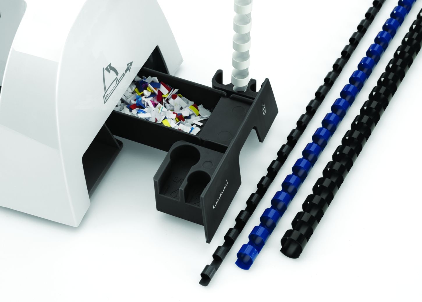 Oddělená děrovací a vázací páka pro průběžné vkládaní děrovaných listů do plastového hřbetu výrazně zefektivňuje práci. Díky delší děrovací páce je třeba k děrování minimum síly. Stroj je vybaven integrovanou měrkou pro správnou volbu průměru hřbetu.