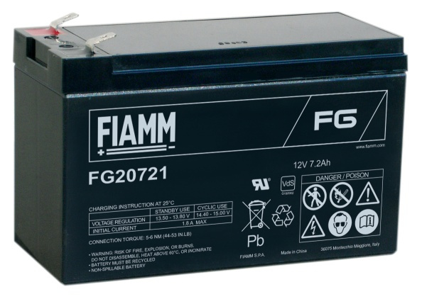 FIAMM FG20721 je hermeticky uzavřený, záložní, bezúdržbový olověný akumulátor určený pro záložní zdroje UPS a jiné elektronické systémy, kde je kladen důraz na vysokou spolehlivost. Baterie Fiamm mají vysokou kvalitou zpracování, lze je provozovat v libovolné poloze a nevyžadují žádnou údržbu.